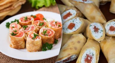 Po vychladnutí palačinku vyjměte z pergamenu, potřete ji krémovým sýrem, vyložte plátky červené ryby a celou ji srolujte.